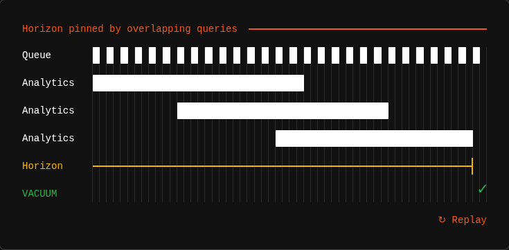 The catch is that Postgres won't vacuum away any dead tuple that might still be visible to an active transaction. The oldest running transaction sets the cutoff β called the "MVCC horizon." Until that transaction finishes, every dead tuple newer than its snapshot gets retained. One analytics query that takes two minutes to complete pins the horizon for the full two minutes. And during those two minutes, dead tuples from your high-throughput job queue pile up with nowhere to go.